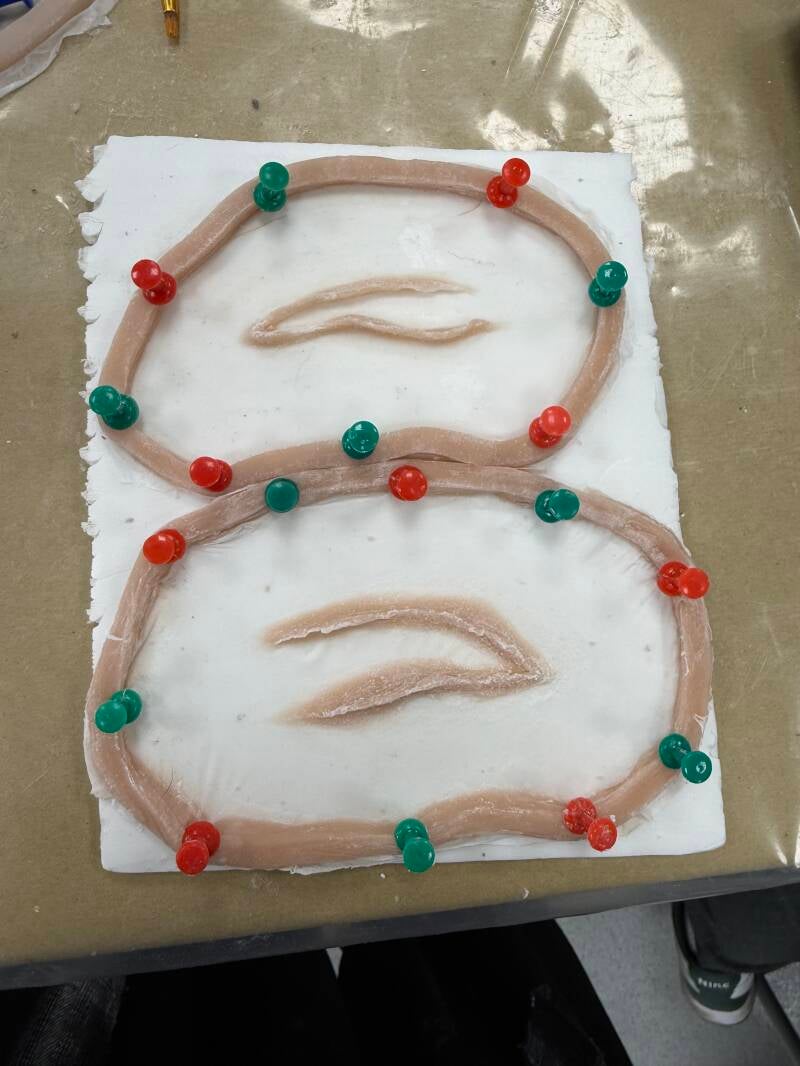 Once out the mould the prosthetics were mounted of some foam with pins so they kept their shape through transportation. This process was repeated x2 times so I would have a backup set of prosthetics just in case.
