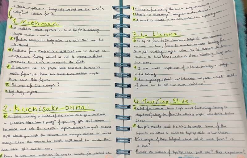 The next thing I wanted to map out was which myths and legends I wanted to do as there is so many different myths, with multiple ‘characters’, with so many spins and different cultures. To chose I wrote down as many as I could remember from when I was younger, hearing about at sleepovers, things my parents told me and what I’ve heard about growing up. From there I chose the four that interested me the most, trying to chose ones from different cultures and places around the world.